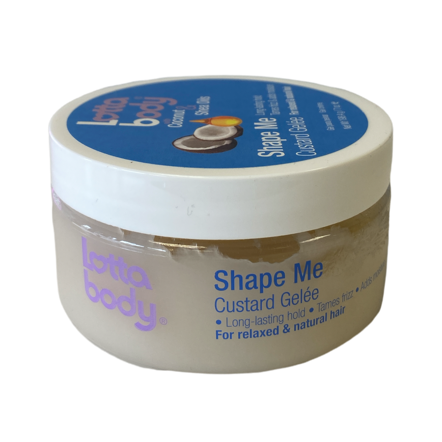 Lottabody Shape Me Custard Gelee. Coconut and shea oils deeply hydrate hair from the inside out, leaving hair soft and nourished with brilliant shine. Provides long-lasting hold while adding moisture to textured and straight hair. Enhances manageability and shine by taming frizz and adding moisture. Will not leave hair greasy, sticky, or crunchy.