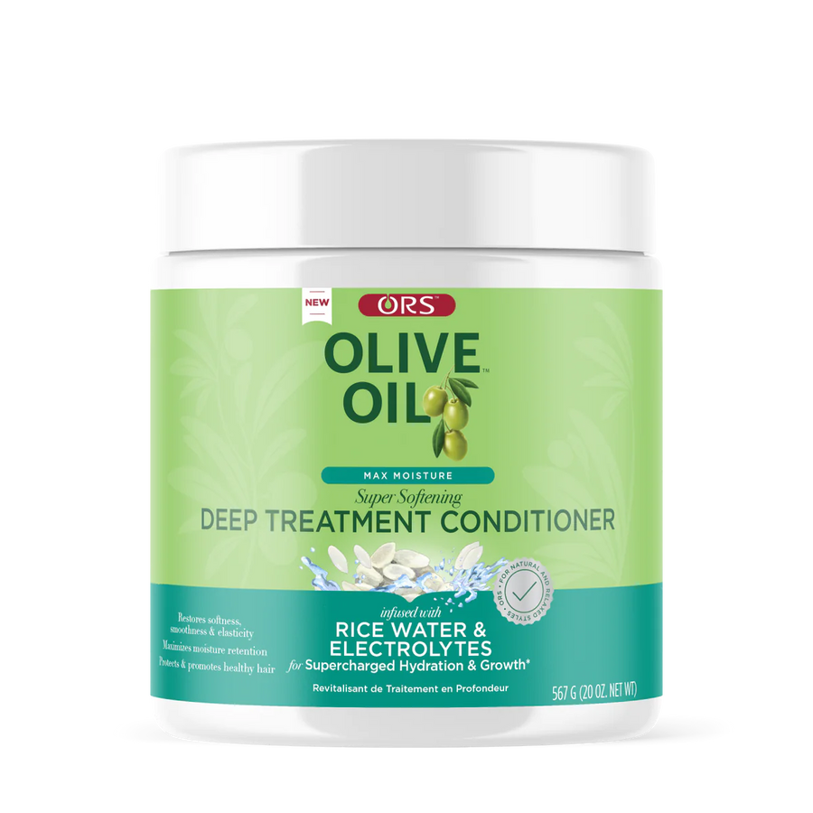 ORS Olive Oil Max Moisture Deep Conditioner delivers super softening results for natural and relaxed hair. Richly moisturises, strengthens and restores-delivering superior hair hydration for super-nourished and super-soft strands while promoting healthy hair with Rice Water, Electrolytes, Olive Oil and proprietary Oligro™ Complex.